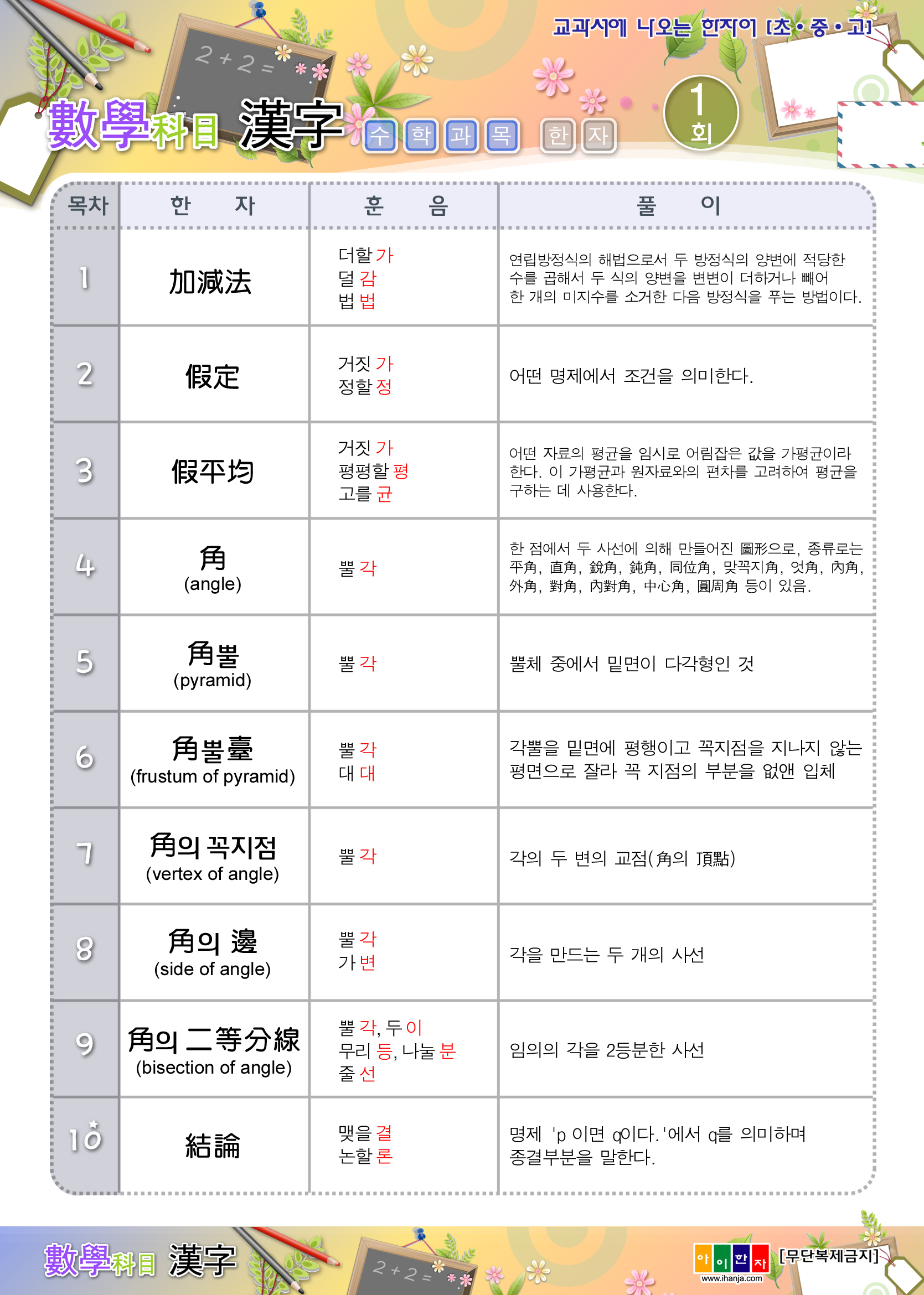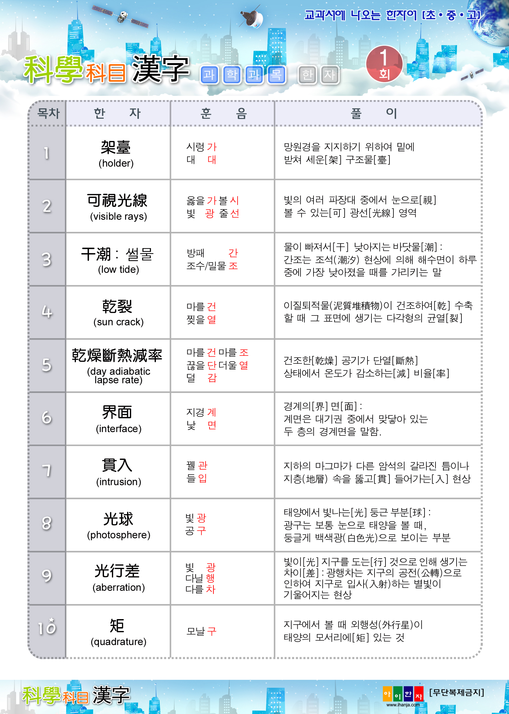 안녕하세요... 아이한자입니다. 아이한자는 과목별 한자 서비스(사회, 수학, 과학)를 아래와 같이 안내드립니다. ▶구성 내용 사회(1회-16회) : 가석방-희소가치 수학(1회-22회) : 가감법-회전체 과학(1회-17회) : 가대-흑점 감사합니다.