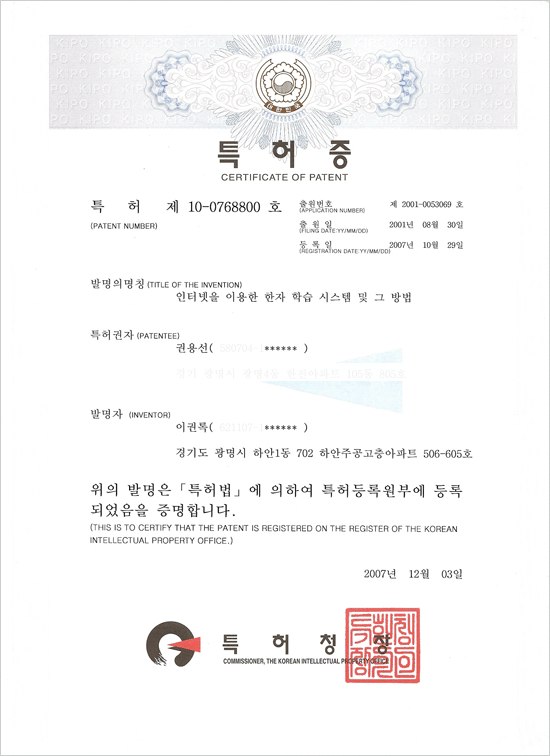특허증(인터넷을 통한 한자 학습 시스템 및 그 방법)