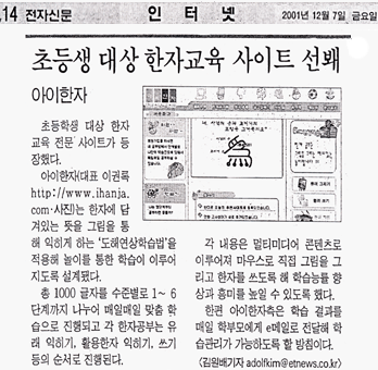 2001. 12. 07 [전자신문] 초등생 대상 한자교육 사이트 선봬